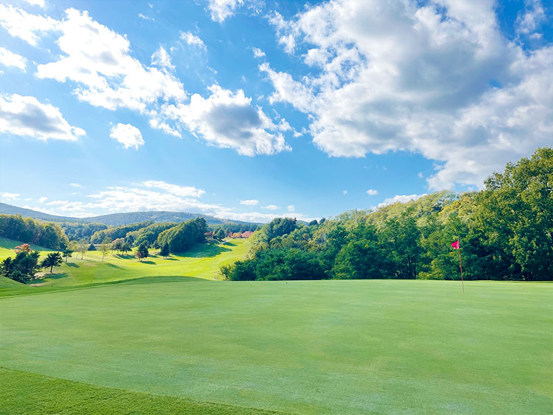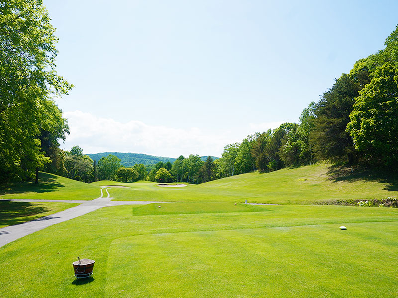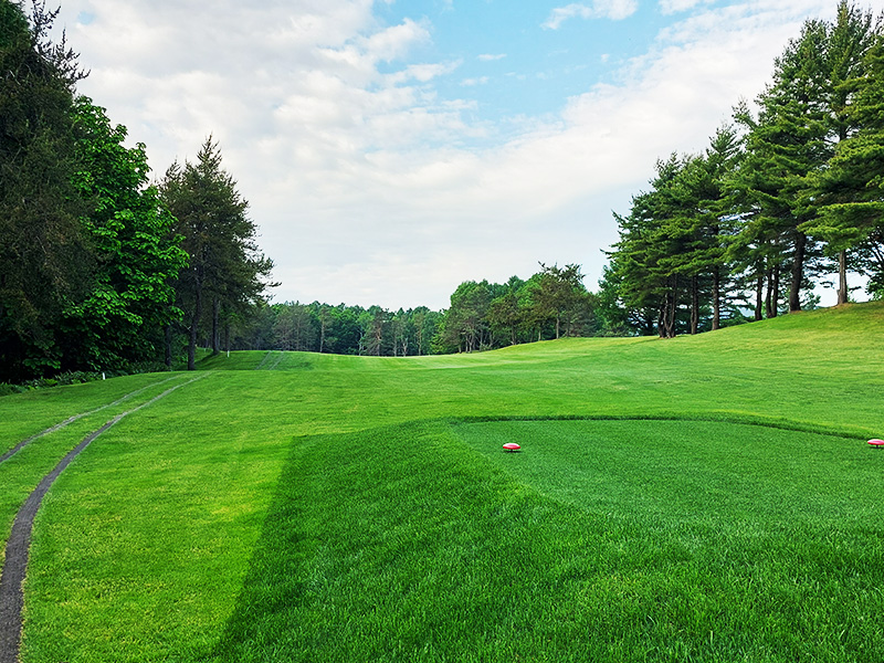 右方向はセカンドでグリーンがねらいずらいので左の山裾狙い。上りで左右にバンカーがあるので10Y位大きめで狙う。グリーンは奥から傾斜もあり非常に早い。