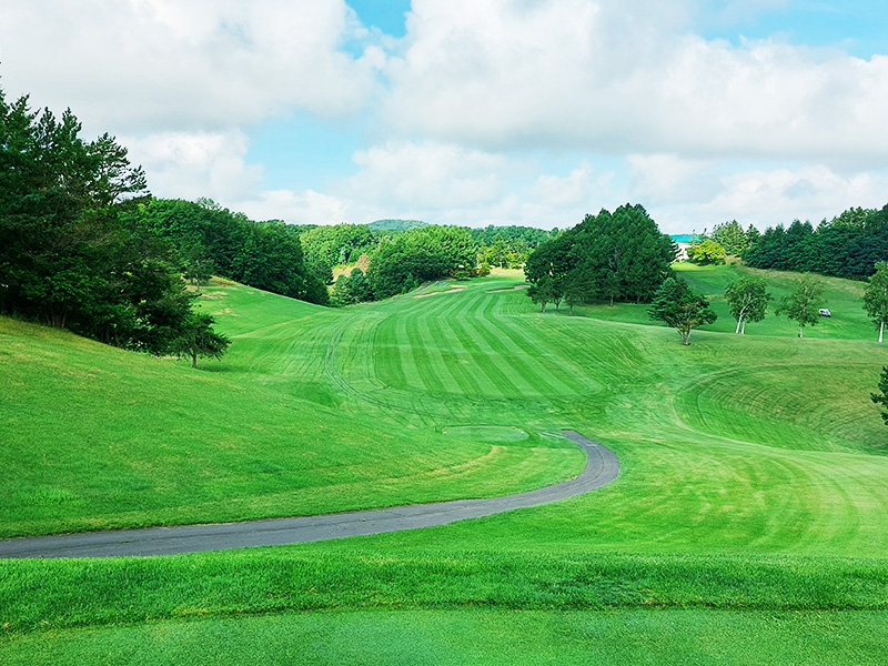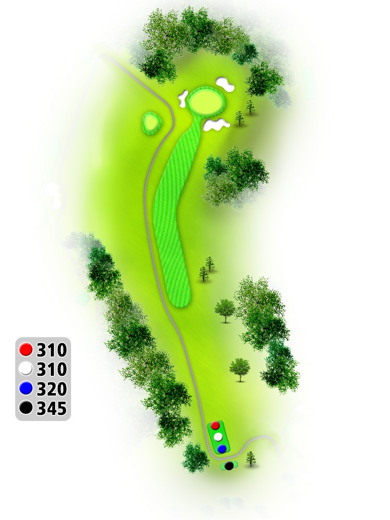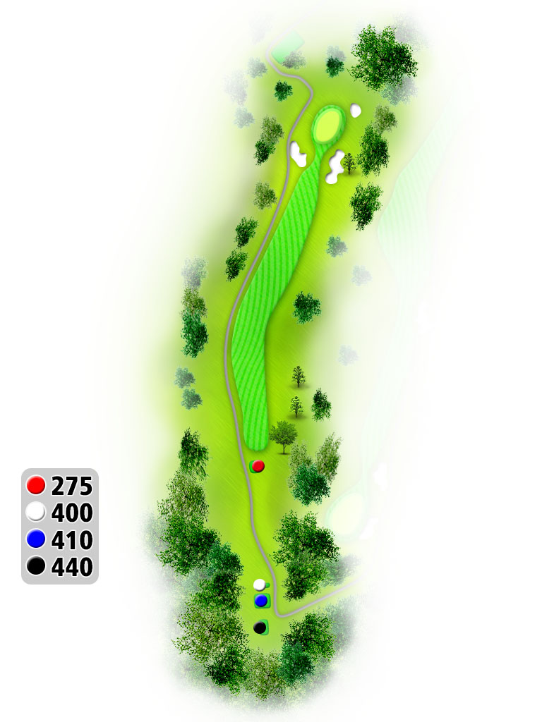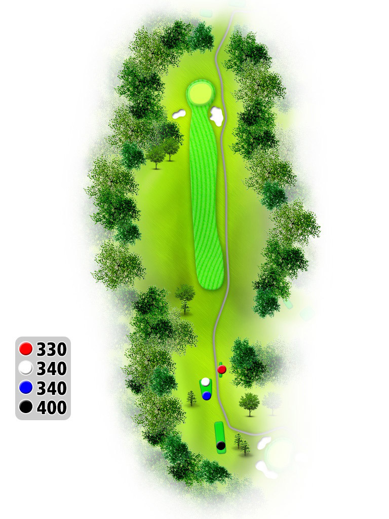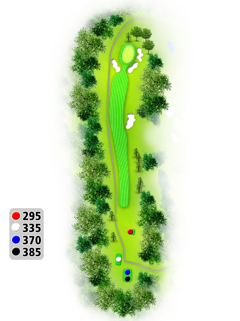 軽いドックレックで左はOB。OBの場合はプレイング4。真正面の木まで280Y位で狙い目。受けグリーンで奥から順目。
