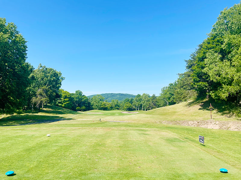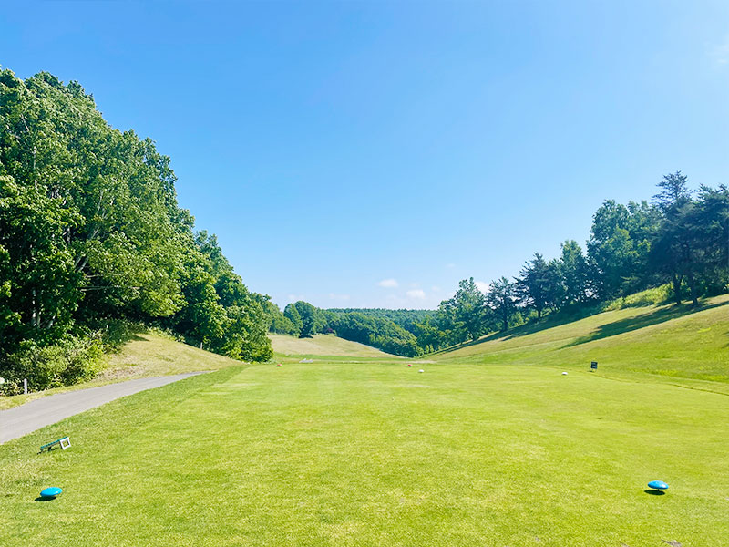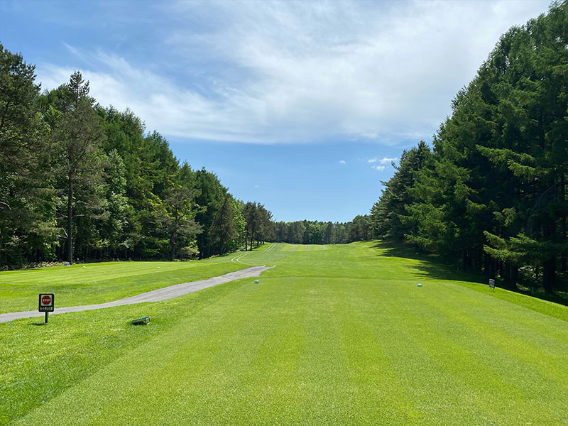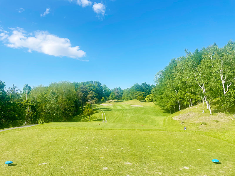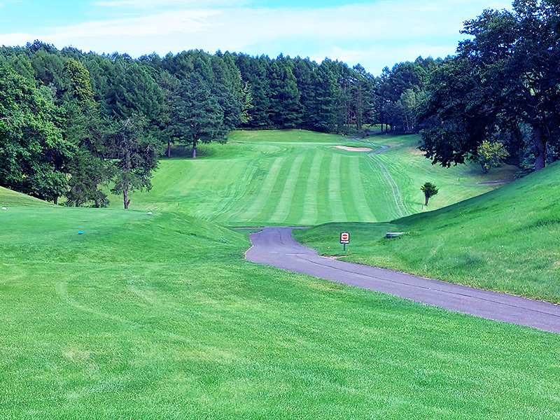 打ち下ろしで短めの右ドックレック、やや左目狙い。ロングヒッターは前組に注意。右林に入れると最悪。グリーン奥はOBなので-10Y位手前から。グリーンは右奥から早い。